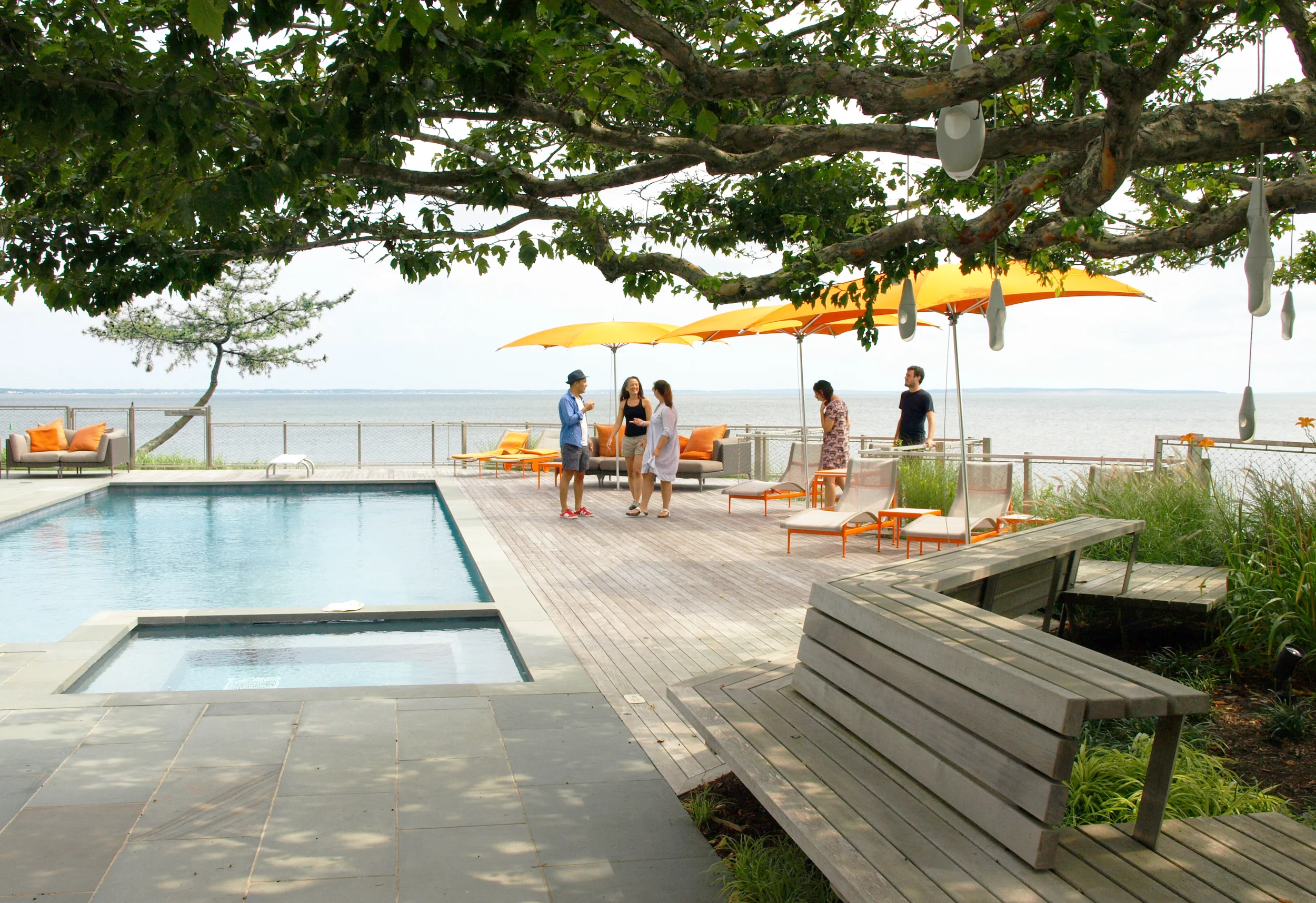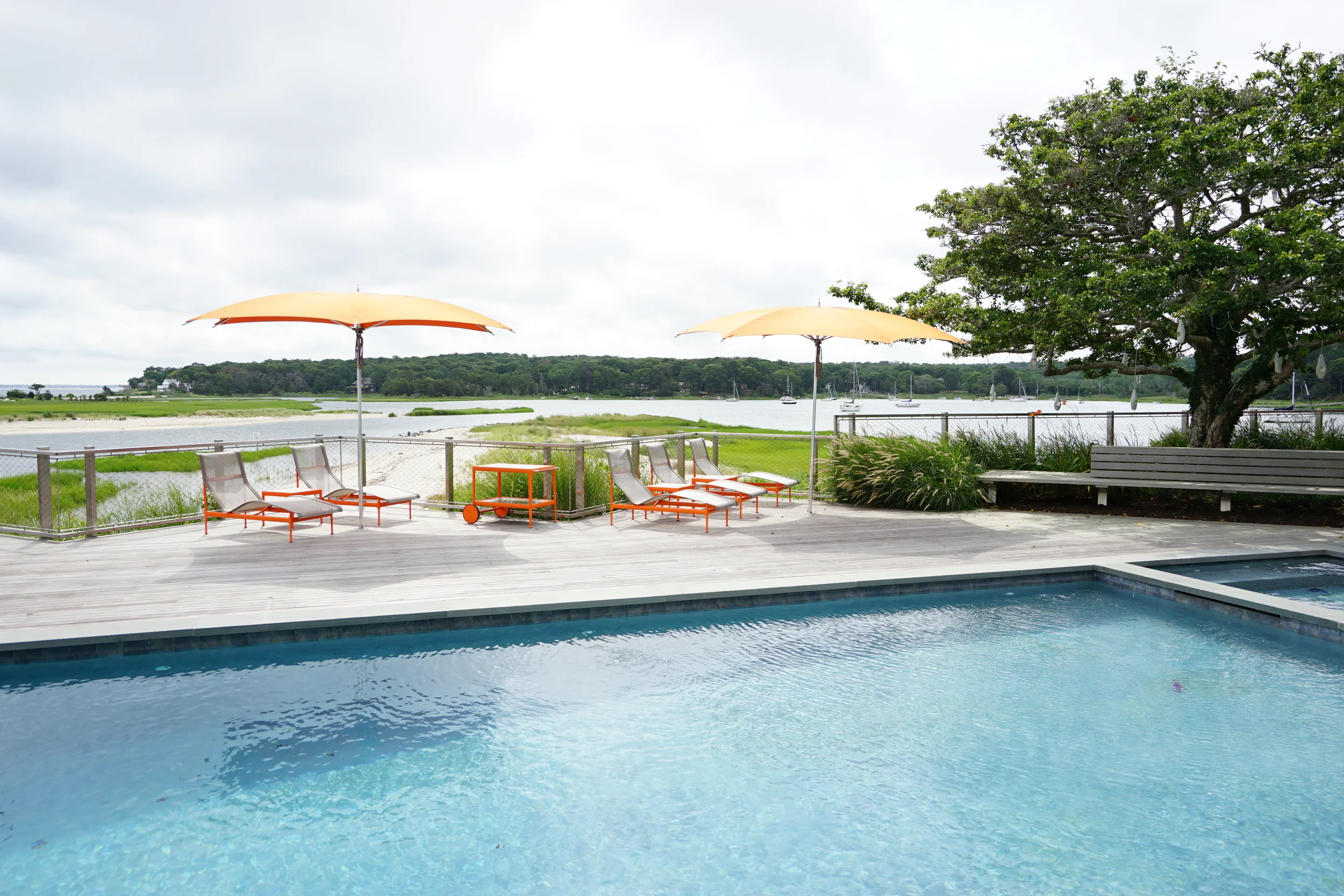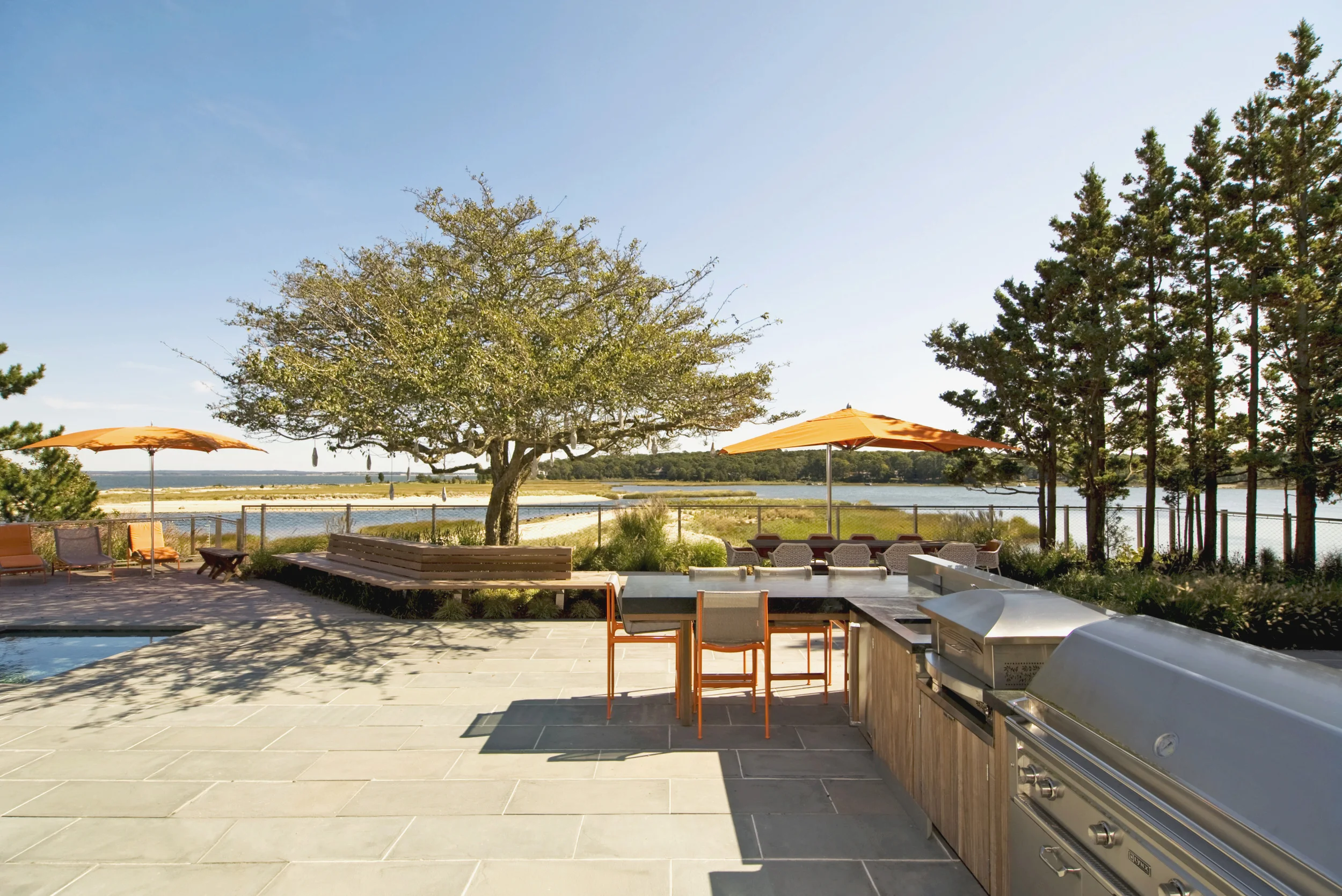 The reorganization of the house oriented the living spaces to the stunning, 280 degree views of the Great Peconic Bay and the mouth of a small creek estuary. The designed landscape is a wide, open plinth which sits above the coastline providing elevated views of the waters. The expanded deck landscape sits lightly above the grade and bites together with the existing site in a saw-tooth layout which help orient vies to the dramatic neck between the two bodies of water. The sloped landscape is heavily planted in coastal natives to mitigate the visual impact of the residence, while the terrace provides an expanded living space complete with a pool, lounges, large dining space and fully functional outdoor kitchen. Terrain worked closely with the interior spaces, matching the material and furniture palette in order to create a continuation the living space as it transitions into the landscape.