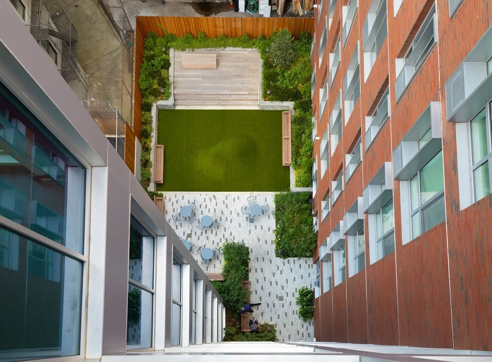 The Corden, a multi-family, supportive housing building for survivors of domestic violence opened in the Longwood neighborhood of the Bronx in 2022. Terrain designed a communal, residential courtyard in collaboration with MAP Architects and a public basketball court and park for adjacent NYCHA residents. Many children call the building home and the courtyard design creates “playable ground,” rather than a playground. Topography, artificial turf, bleacher seating, custom timber benches, and a deck provide ample room for exploration and play within a contained outdoor space. The courtyard is heavily screened to provide privacy and security for residents without feeling heavy handed. Permeable pavers add a pop of visual interest and draw residents out into the landscape. The adjacent basketball court is fully renovated and open to the public.